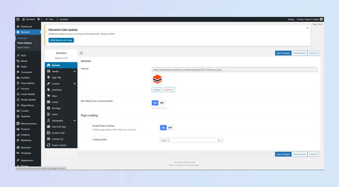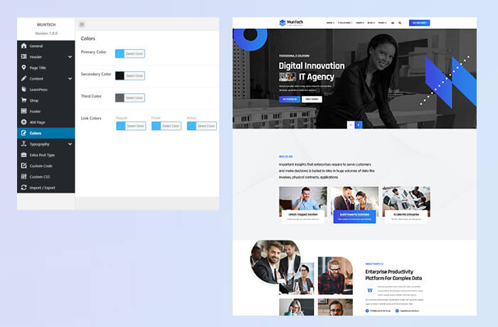 Muntech comes with live color customizer. So that you can make changes and see them in Front View.